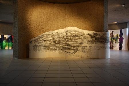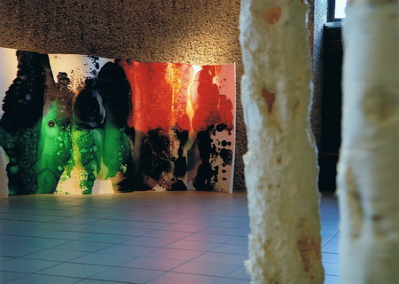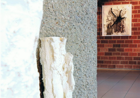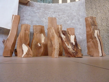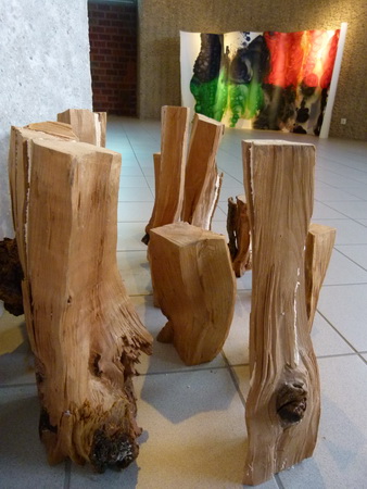 Und er zeigt uns die Ergebnisse seines Arbeitsprozesses, seiner Arbeit am und mit dem Zellstoff mit Wasser, Feuer, Werkzeugen, Fetten und Farben.Heuwinkel transformiert seine Erscheinung, greift in das Material ein, dringt in das Material vor. Besonders die Außenskulpturen – hier pflanzt er in die Zellstoffblöcke