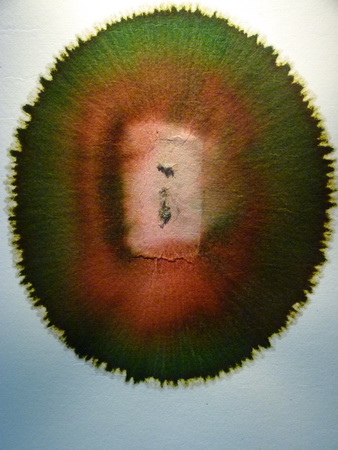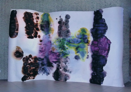 Vorgang und das „Material malt für ihn“. Dünnflüssige abgeleitete Aquarellfarbe verwandelt den Zellstoff in eine abstrakte Farbwelt. Die großen Chromatographien