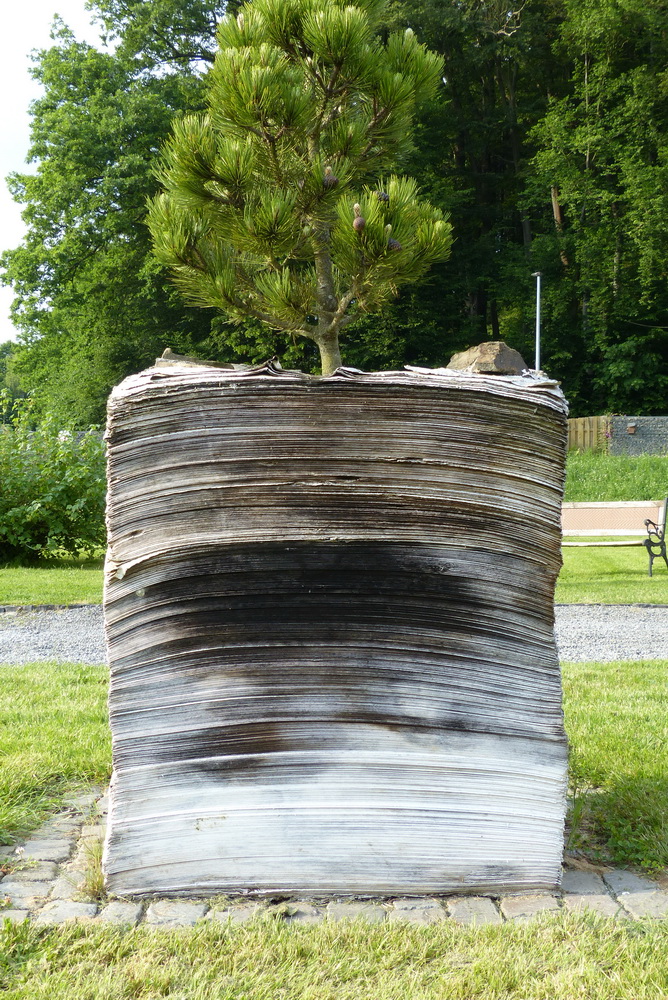 Baum und Zellstoffsockel: Der Baum wächst in dem Zellstoffblock. Es