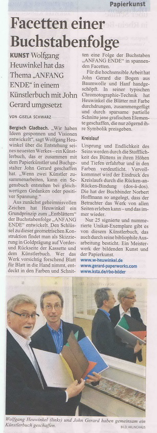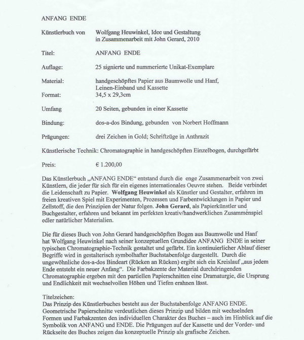 ...from the conversations with the artist, the selections of colors has been based on his intuition for the age old theme of the alpha and the omega: His thoughts for each word are : "ANFANG" (beginning) "A" begins with yellow for sunrise/beginning of day; "N" brown for earth ;"F" green for nature; "A" red for the colors of the garden; "N" blue for the sky; and "G" yellow for sunset/end of day. ENDE (end) "E" violet, complementary color to yellow, the opposite to beginning; "N" brown for the past or transitoriness; "D" yellow for the shimmer of hope; "E" blue for the vastness of space. ...die Auswahl der Farben basiert sich auf seine Intuition sowie das alte Thema des Alphas und Omegas. Seine Gedanken für jedes Wort waren: ANFANG: "A" gelb für den Sonnenaufgang/ der Anfang des Tages; "N" braun für die Erde; "F" grün für die Natur; "A" rot für die Farben des Gartens; "N" blau für den Himmel; "G" gelb für den Sonnenuntergang/Ende des Tages. ENDE "E" violett, Komplimentär Farbe zu gelb, das Gegenteil zum Anfang; "N" braun für die Vergangenheit oder Vergänglichkeit; "D" gelb für den Schimmer der Hoffnung; "E" blau für die Unendlichkeit des Raums.