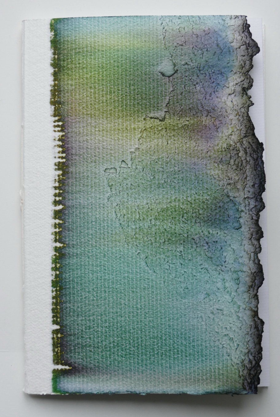 eingefärbt und von Hand gerissen, dieses Verfahren nennt sich Chromatografie und die Besonderheit daran ist, das jeder Umschlag somit ein Unikat ist.
